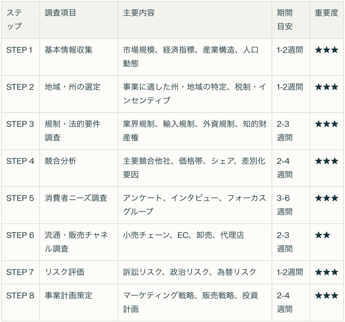 アメリカ調査を成功させるためには、体系的なアプローチが必要です。以下に示す8つのステップを順次実行することで、効果的な市場調査を実現できます。
