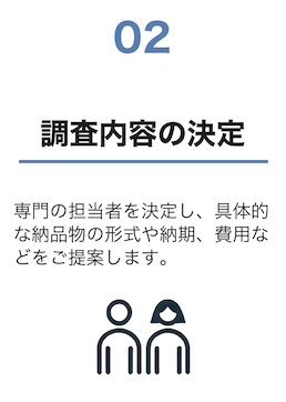 A. 納品物には、情報の出典元やインタビューの相手先を明確に記載し、透明性を確保しております。また、必要に応じて同一調査を複数の調査員で実施することで、調査結果の精度と信ぴょう性をさらに高める取り組みを行っております。