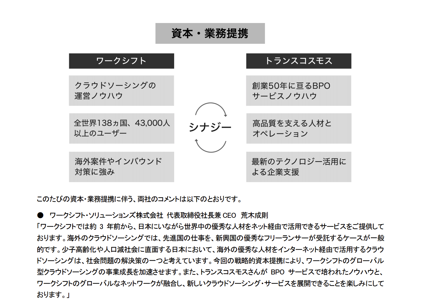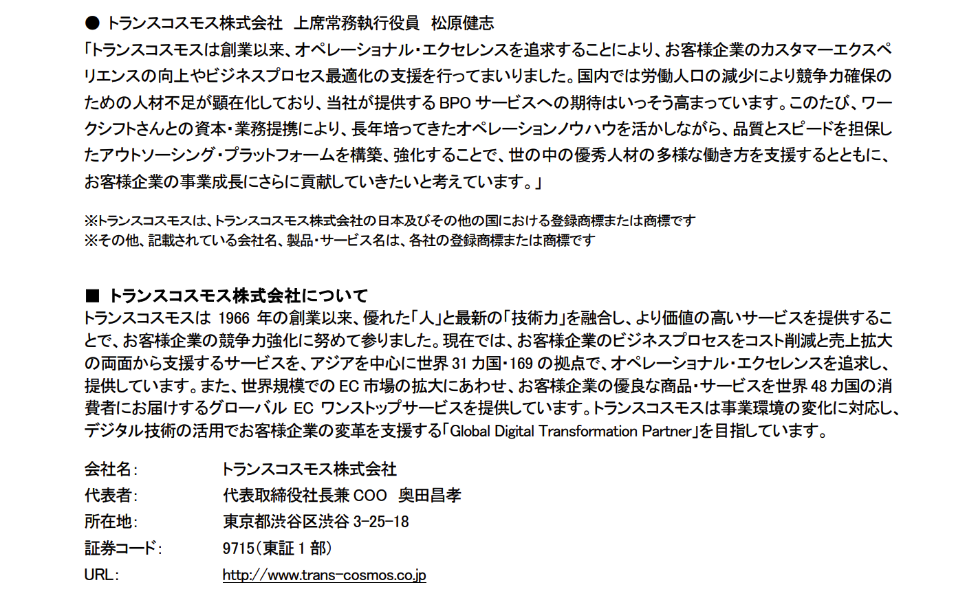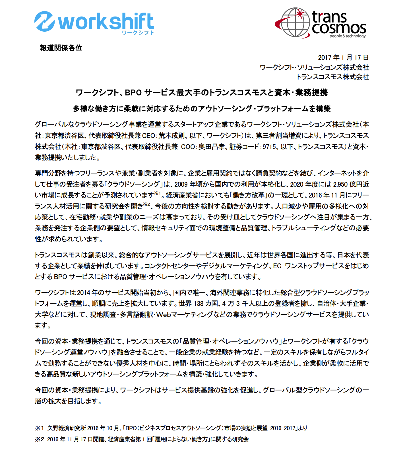 プレスリリース | PRESS RELEASE トップページ > プレスルーム > 2017年01月17日 BPOサービス最大手のトランスコスモスと資本・業務提携いたしました - 2017年01月17日 - 詳細PDFはこちら