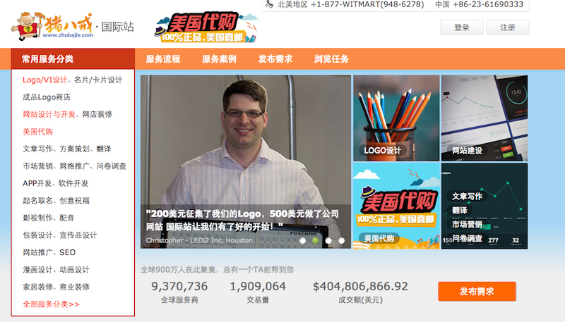 世界最大規模のユーザー数を擁するクラウドソーシング企業が中国にも存在します。サイト名は猪八戒(zhubajie、英語名Witmart.com)です。中国のみならず米国、カナダにもオフィスを構えています。会員数は1,200万人を超え、成約した仕事の実績は米ドルで9億5千万ドル以上と公表されています。ロゴデザイン、Webデザイン、翻訳、コピーライティング、マーケティングが主な依頼のカテゴリーとなっています。支払いは人民元ではあるものの、中国のみならず世界中から仕事依頼が掲載されています。依頼内容の記載言語は中国語と英語がほとんどですが、中国以外の国からも中国語で仕事依頼されているのが特徴的であると共にやや驚きを感じます。それだけ中国語が国際語として使われているのを感じます。