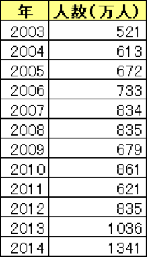しかし、2007年からの世界金融危機、2008年のリーマン・ショックによる世界的な不況の影響を大きく受け、2009年は679万人と大きく落ち込み、2011年も東日本大震災と福島第一原子力発電所事故で落ち込みました。 ところが2012年末からアベノミクスによる円安が進むと訪日外国人旅行者数が急回復し、2013年に年間1,036万人を記録し、初めて1,000万人の大台を超え、2014年は1341万人を記録しました(表1参照)。 行政による政策が功を奏しています。