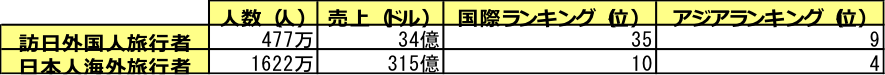【表2】訪日外国人旅行者数と日本人海外旅行者数の実情