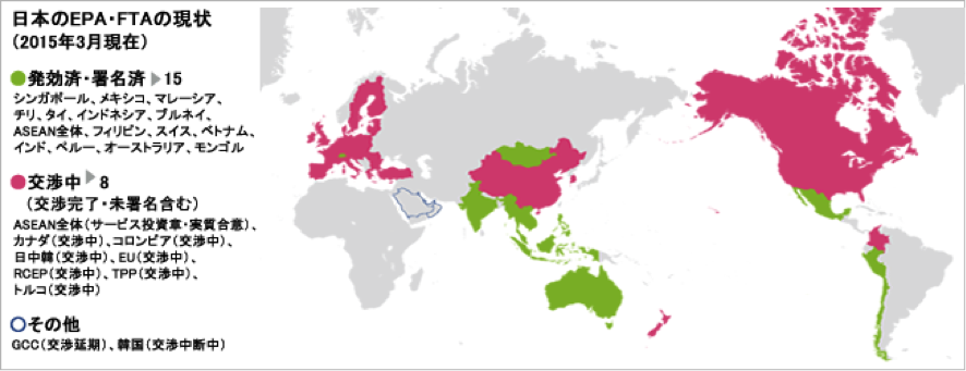 近年、先進国では経済の発展や高齢化が進み市場が成熟することで、国内のみでの急成長を望みにくい状況になっています。一方新興国では中間層の台頭により、安い労働力だけではなく新たな消費者が誕生しています。そこで先進国の多くは、焦点を成長が見込める海外、特に新興国に向けるようになりました。先進国と新興国による新たな経済圏を確立させるため、貿易の障害となる関税の削減や撤廃をおこなう目的でEPAやFTAなどの自由貿易協定が積極的に結ばれるようになりました。