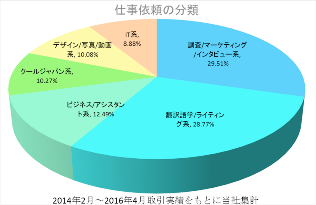 ワークシフトのサイトで過去2年間に掲載された仕事を分類したデータが下記チャートです。大きく分けると、『海外市場調査、Webマーケティング』、『翻訳・ライティング』、『ビジネスアシスト』、『デザイン』、『IT』と続いております。