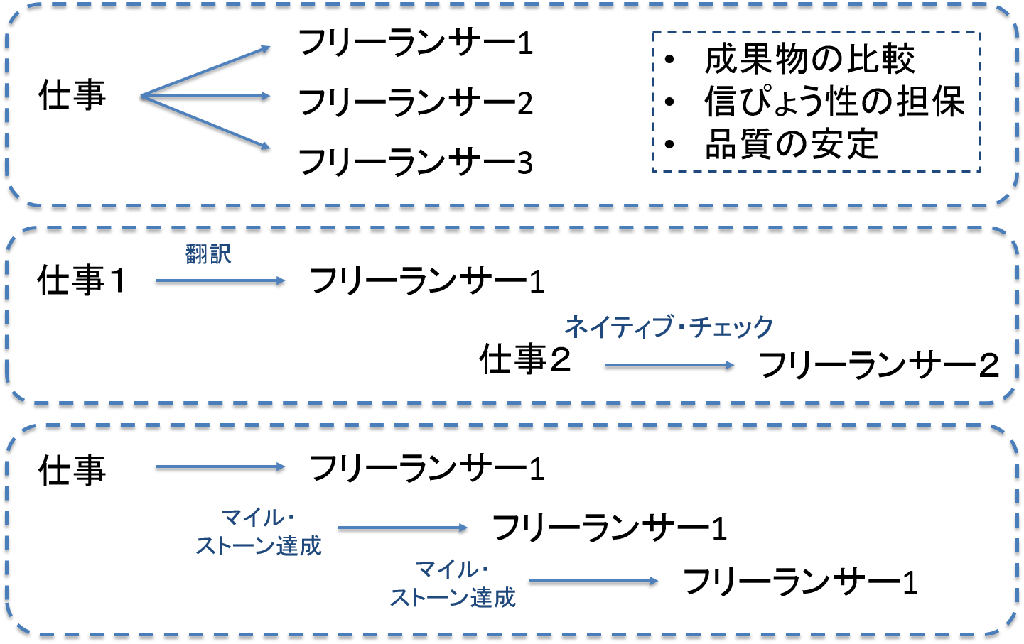 また、同時に複数の人に仕事を依頼する事で、「成果物の比較」をし、信ぴょう性を確認することも可能です。 また、仕事に節目(マイルストーン)を設定し、欲しい成果物がどの程度進捗しているかを確認することも出来ます。