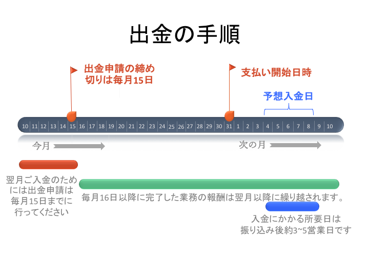 ・支払申請の締め切りは毎月15日(日本時間)です。