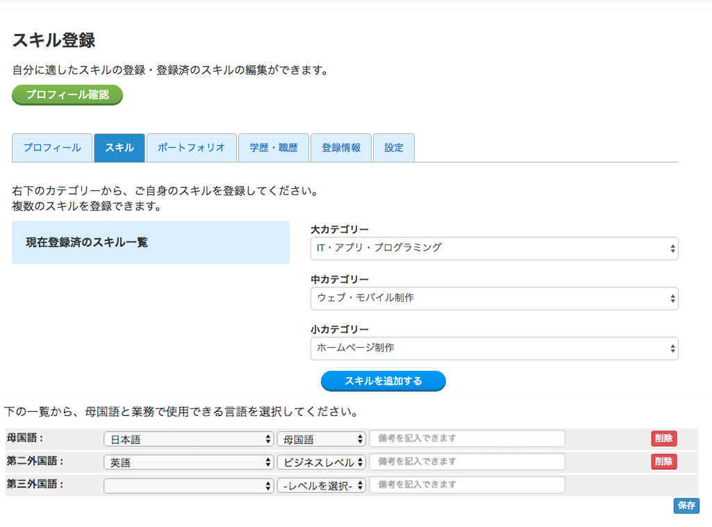 ・「プロフィール」ボタンをクリックし「スキル登録」画面に行ってください。